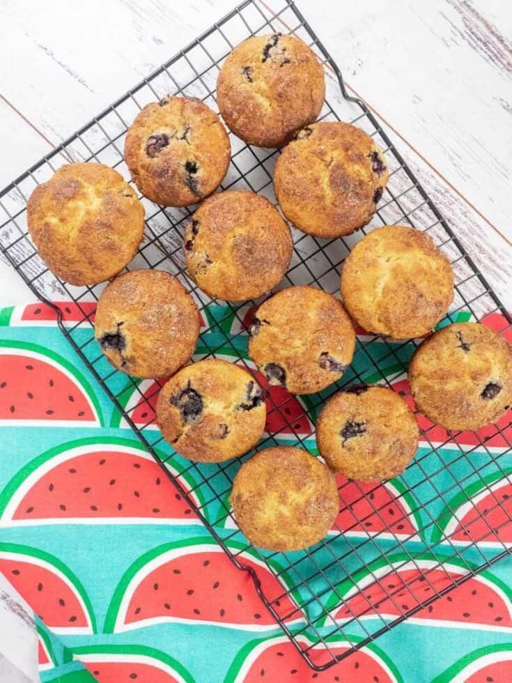 Combine the cinnamon and sugar in a small ramekin or cup ready for the topping. Spoon the mixture evenly into the muffin tin and scatter cinnamon sugar on top of each muffin. Bake for 12-15 minutes until cooked through. If you want to double-check they are cooked you can insert a toothpick into one or two of the muffins and it will come out clean (unless you pierce a blueberry).